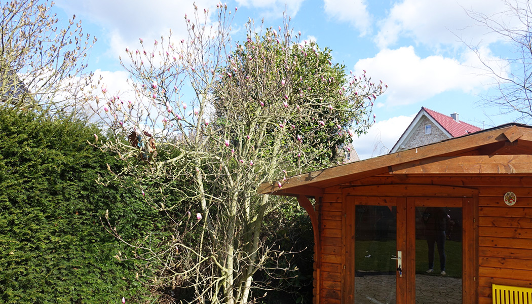 In meinem Garten steht ein kleiner Magnolienbaum, der als kleiner Farbkleks neben unserer Gartenhütte gepflanzt ist.